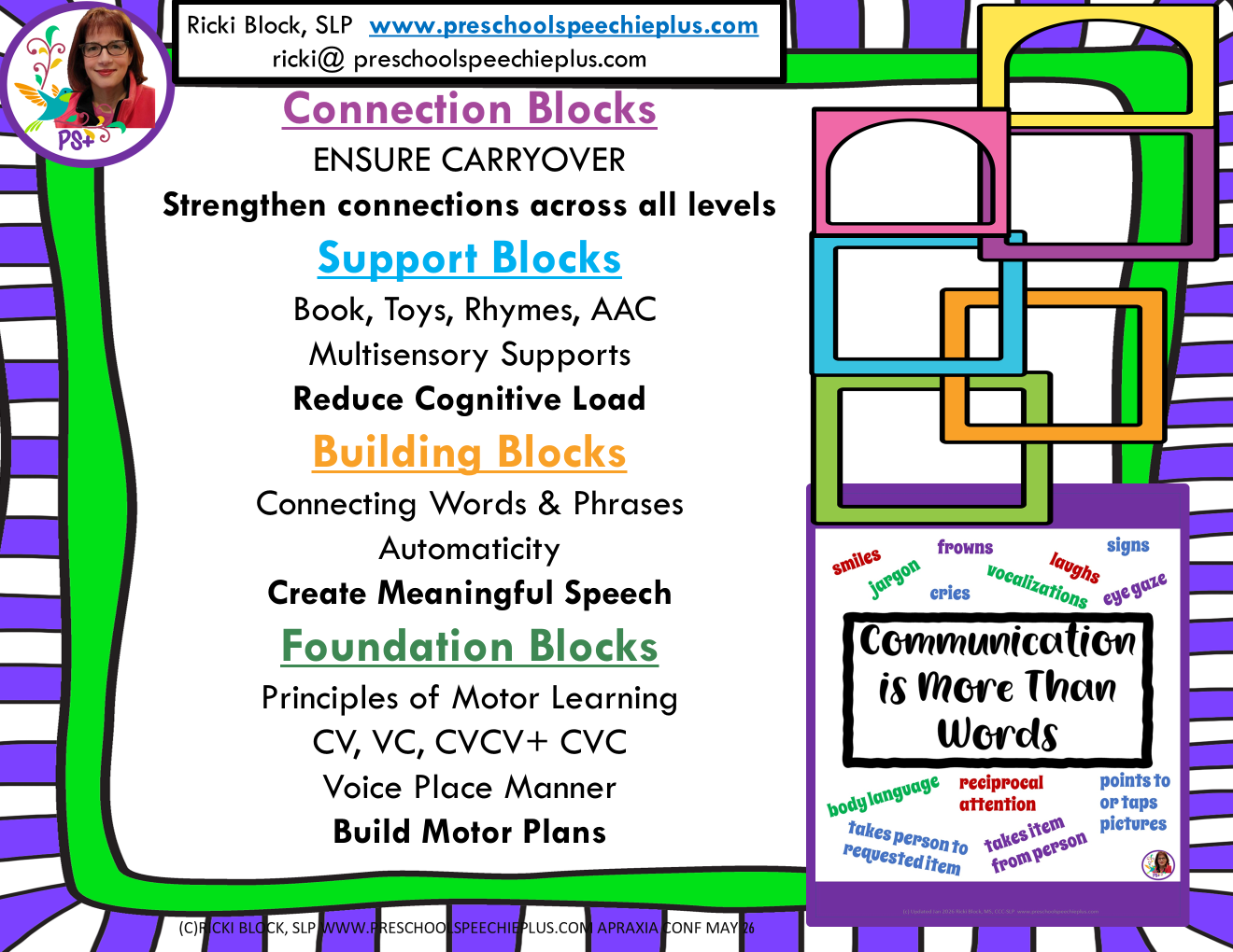 Ricki Block, SLP (Me!) will be presenting over 50 years of clinical experience serving children with Apraxia